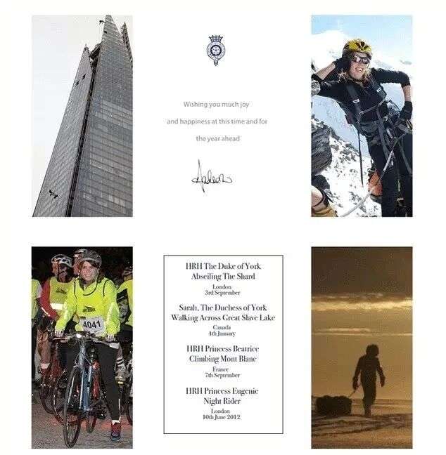 更离谱的是,次年他再次寄出圣诞贺卡,附件中的照片数量更多,不仅有女儿们参加慈善骑行、登山的日常,还有前妻莎拉·弗格森以及他自己高空绳降伦敦碎片大厦的影像。