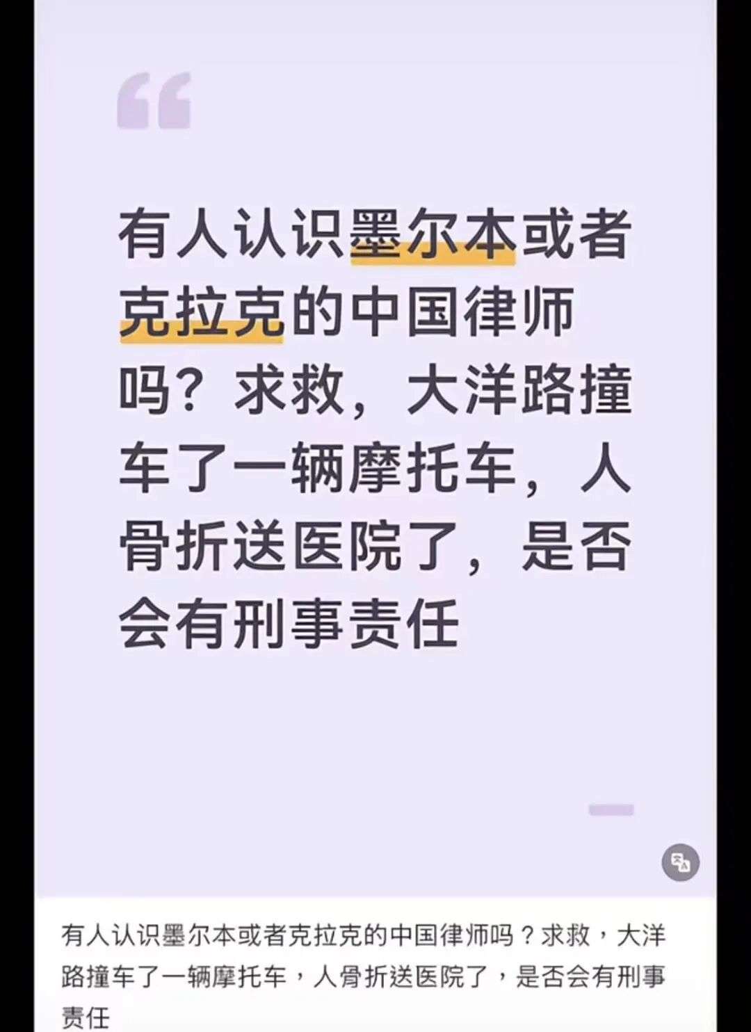 随后,社交媒体上出现了疑似肇事方的求助帖,表示在大洋路撞了一辆摩托车,人骨折送医院了,询问是否会有刑事责任。