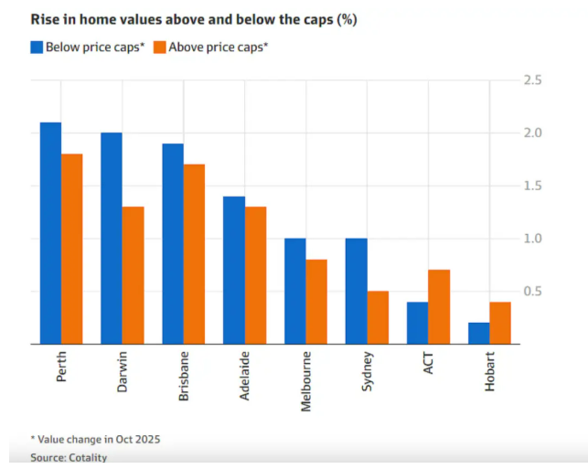 Cotality的数据显示,符合首付计划价格上限的城区(悉尼150万、墨尔本95万、布里斯班100万等),10月房价涨了1.2%,而超出上限的城区只涨了1%。在墨尔本内东区,低于95万的房子10月涨了1.7%,涨幅是高端区的四倍多。专家说,过去两年低端市场涨得最快,房价涨速一度是工资的10倍,逼得首次置业者只能往低端市场挤,结果越挤越涨。