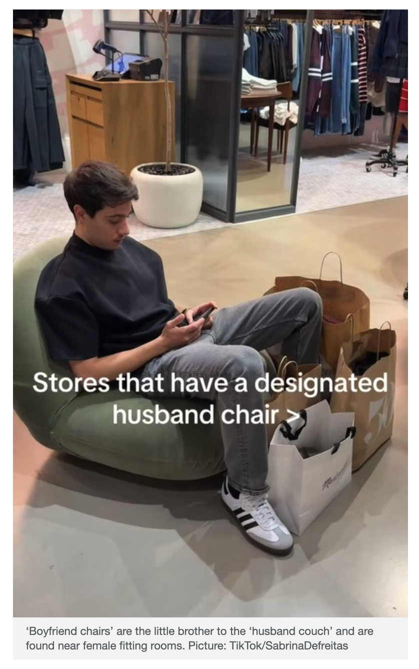 最近一张在社交媒体流传的照片显示,许多男性坐在购物中心 Uniql o 门口的沙发上休息,这一画面迅速引发网友热议。有人戏称这些座椅是 “husband chairs(丈夫椅)”、“man creches(男人托管区)” 或 “emotional support men couches(情绪支持沙发)”。不少人认为这类设置反映了伴侣陪同购物时的一种普遍场景。