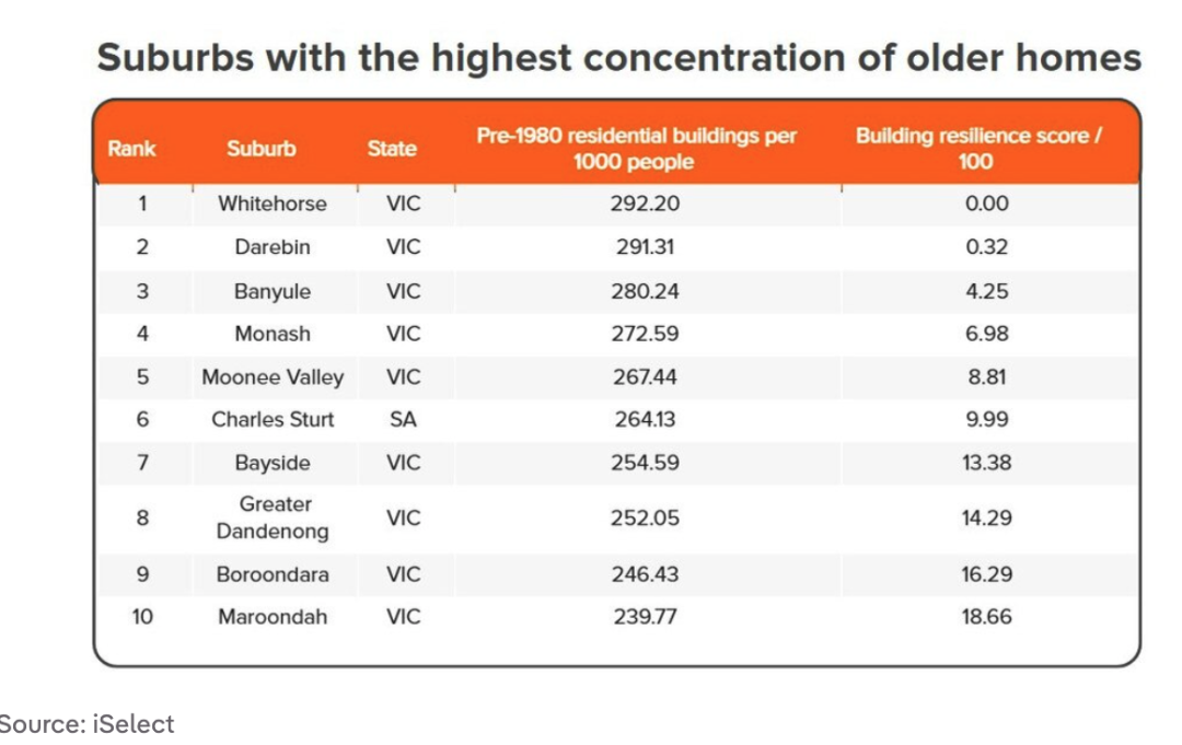 另一方面,墨尔本的whitehorse在老旧住房方面位居全澳之首,每 1000 名居民拥有 292 栋 1980 年前建造的建筑物,建筑韧性得分为零。Darebin、Banyule 和 Monash 的老旧房屋数量也名列前茅,凸显了墨尔本老城区在房屋维护和抵御恶劣天气方面面临的挑战。