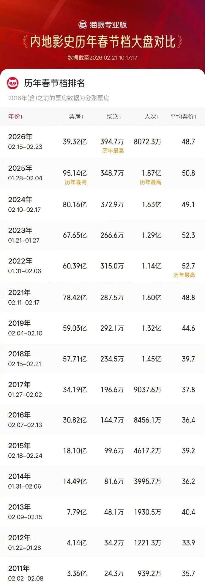 收藏网络平台数据显示,2026春节档总场次超394.7万,刷新中国影史春节档总场次纪录。截至当前,2026春节档总票房已达39.32亿。