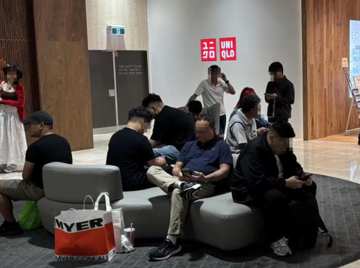 这张被发到社交媒体上的照片里,一群不同年龄的男人瘫坐在Uniqlo门口的沙发上,手里刷着手机,脚边堆着购物袋。