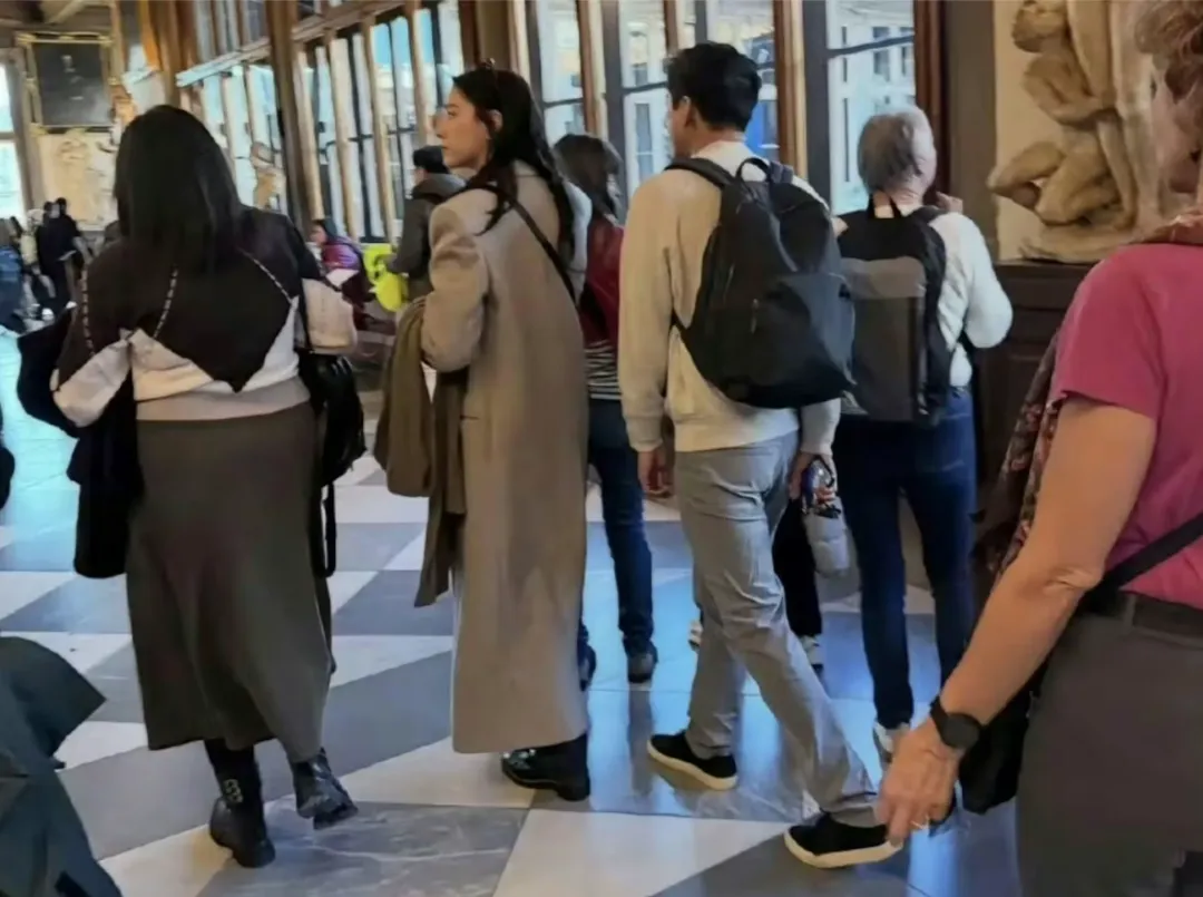 画面中,两人于佛罗伦萨著名的乌菲兹美术馆排队参观,穿着同色系休闲外套,一前一后,互动自然。