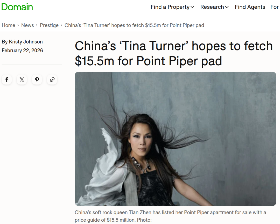 Domain今天报道,中国歌手田震位于悉尼Point Piper的公寓再次挂牌出售,本次指导价为1550万澳元。