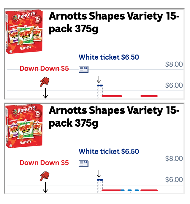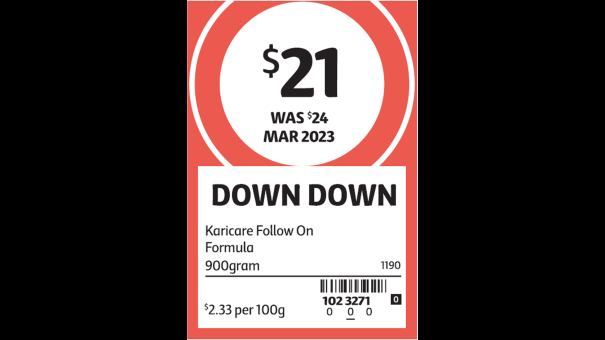 2023年3月,Coles将价格上调至24元(涨幅33%),换回普通白色价签。23天后,价格降至21元,产品再次挂上“Down Down”标签,并标注“原价24元”。