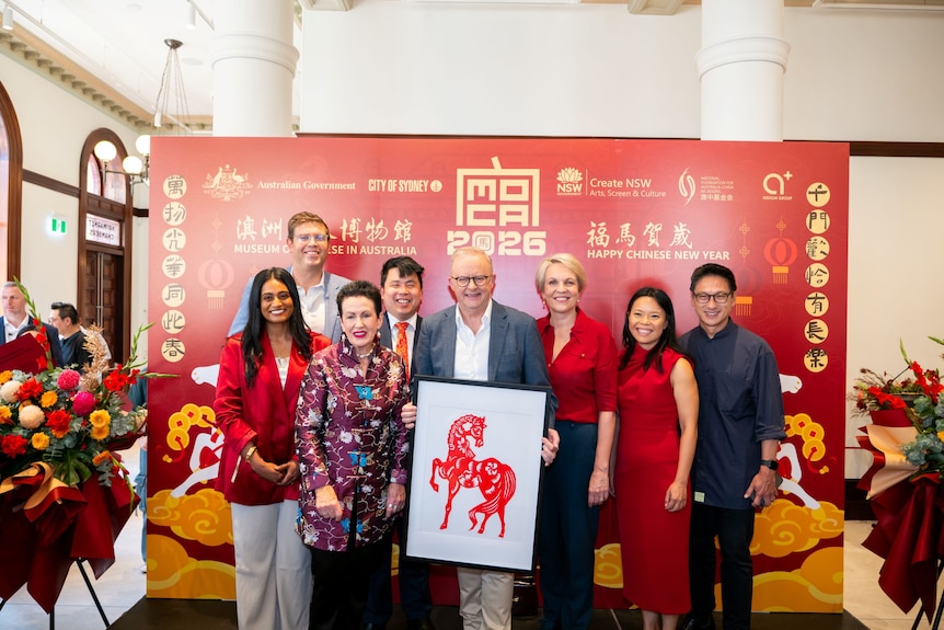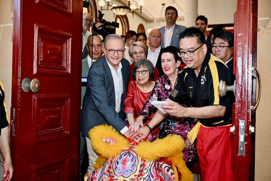 澳大利亚总理阿尔巴尼斯、澳洲华人博物馆主席刘瑞馨、悉尼市长克劳馥·摩尔一同迎接开馆醒狮。 (Supplied by MOCA)