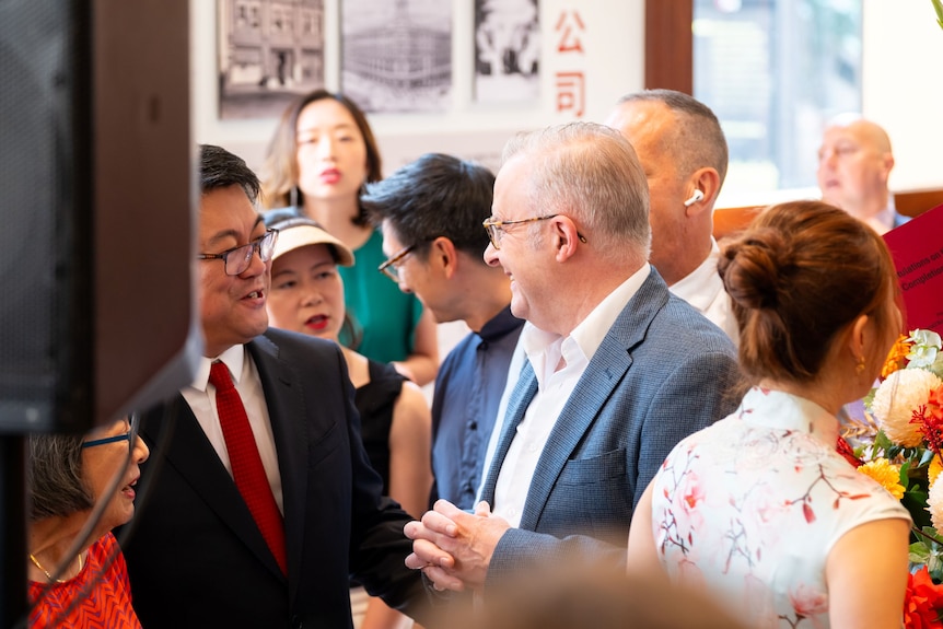 澳洲华人博物馆首席执行官蔡源和阿尔巴尼斯总理交谈。 (Supplied by MOCA)
