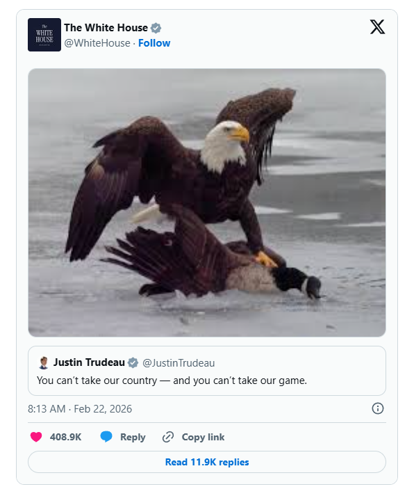 这次,先出面的是白宫的官方账号,他们在社交媒体上甩出了一张图:美国代表动物白头鹰死死踩着一只加拿大鹅,爪子按得很稳,并转发了加拿大前总理特鲁多(Justin Trudeau)一年前的发言:You can’t take our country -- and you can’t take our game.(你拿不走我们国家,也拿不走我们的国球)