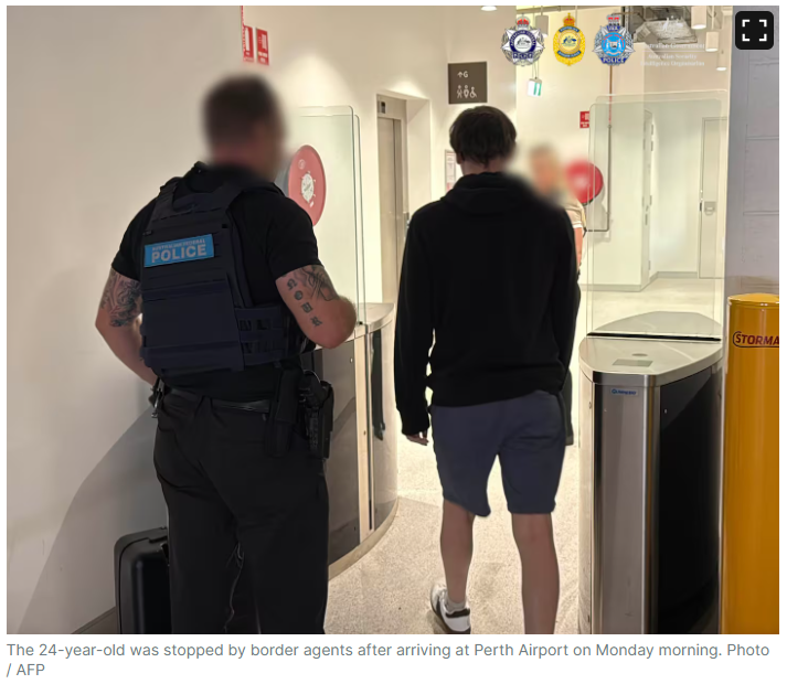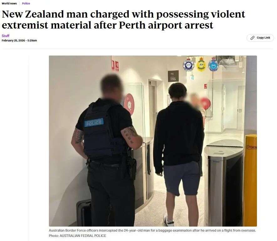 一名24岁的新西兰男子在抵达澳大利亚边境后被逮捕,其手机内被发现存有暴力极端材料。
