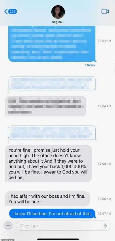 同事说,雷吉娜跟他坦白婚外情后,还给他看了他们之间的短信。