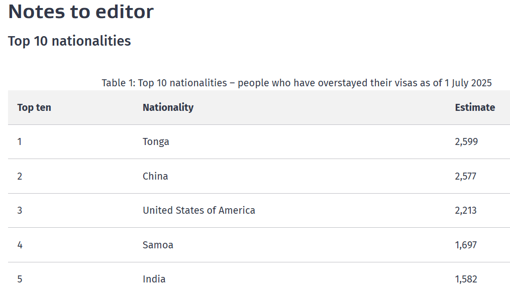 根据新西兰移民局2025年9月的年度评估报告,目前新西兰境内约有20,980名逾期滞留者。