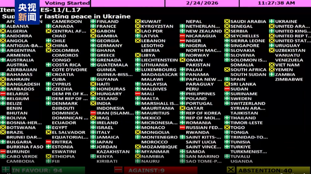 当地时间24日,联合国大会第十一届紧急特别会议复会,通过题为“支持乌克兰实现持久和平”的决议草案,该决议草案获得107票赞成、12票反对、51票弃权。其中,英国、法国、德国、日本、韩国、乌克兰、以色列等投赞成票,俄罗斯、伊朗等投反对票,中国、美国、印度、巴西、南非、沙特阿拉伯等投弃权票。