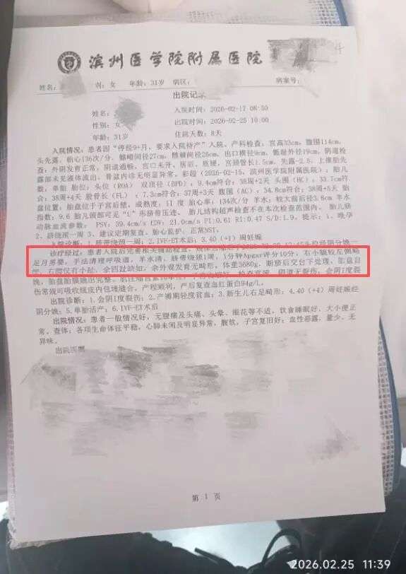 男婴的亲属张先生介绍,产妇张女士今年31岁,丈夫赵先生今年35岁。2021年,两人结婚后,在山东省滨州市居住,由于女方输卵管方面的问题,一直没有怀上孩子。2025年3月,夫妻二人在滨州医学院附属医院做了试管婴儿。2026年2月20日,张女士在该医院诞下一名男婴。不料,新生儿患有先天残疾。出院记录及诊断证明书显示,新生儿右足畸形,右小腿较左侧略细,右脚仅有小趾。
