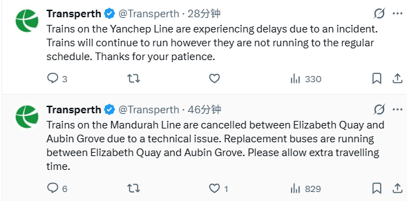 目前,Yanchep线的运行正在恢复,Mandurah线有临时公交替代火车运行。