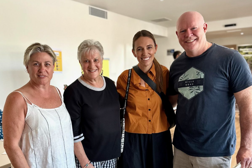 Kiama副镇长Melissa Matters、新西兰任期最长的女性政治家Dame Annette King、前新西兰总理Jacinda Ardern,以及Kiama镇长Cameron McDonald在Gerringong合影。