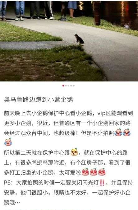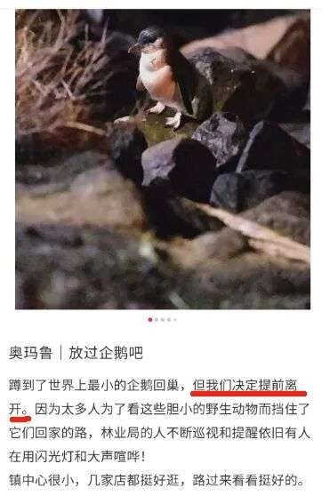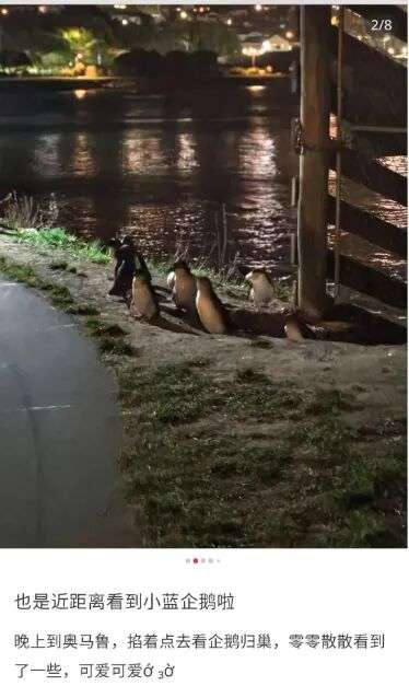 “蹲到了世界上最小的企鹅回巢,但我们决定提前离开。因为太多人为了看这些胆小的野生动物而挡住了它们回家的路……”