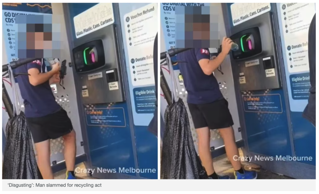 一名男子在 墨尔本 使用自动瓶罐回收机(Reverse Vending Machine)时被拍下疑似欺诈行为,他反复将同一个空塑料水瓶投入机器、又伸手取回,据称通过这种方式累计“赚取”约 50 澳元 的退款。视频由本地账号 Crazy News Melbourne 发布后迅速传播,引发公众关注与议论。