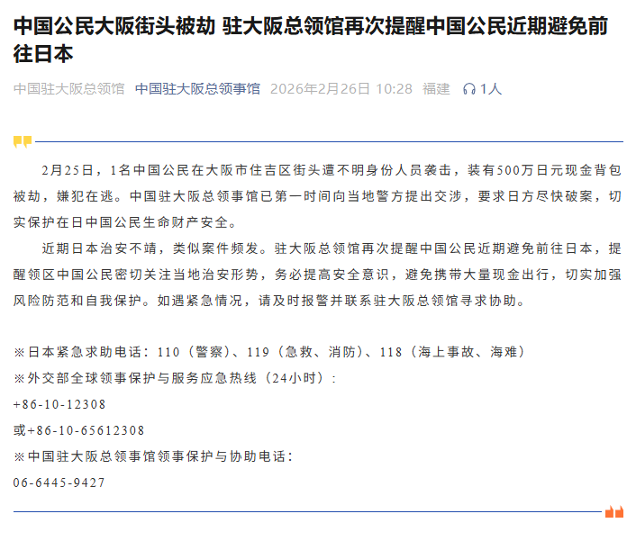 近期日本治安不靖,类似案件频发。驻大阪总领馆再次提醒中国公民近期避免前往日本,提醒领区中国公民密切关注当地治安形势,务必提高安全意识,避免携带大量现金出行,切实加强风险防范和自我保护。如遇紧急情况,请及时报警并联系驻大阪总领馆寻求协助。