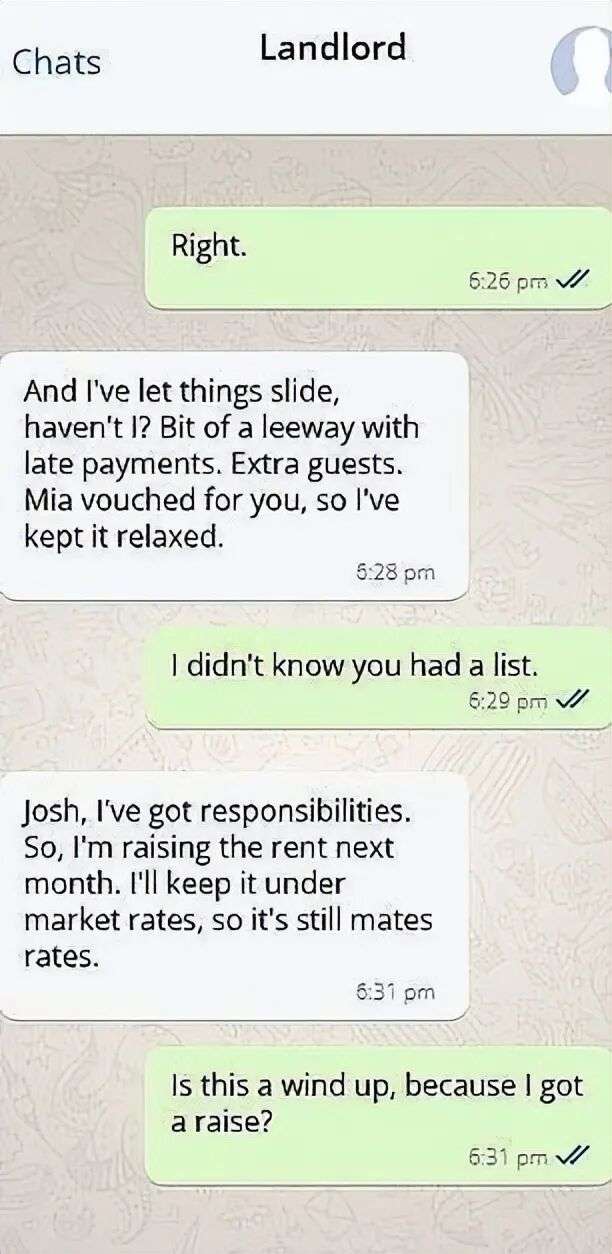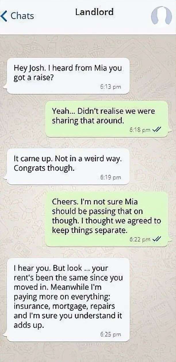 这场风波的起因源于双方共同的朋友Mia。据信,是Mia向房东透露了Josh加薪的细节。房东在短信中开门见山地问道:“嘿,Josh,我听Mia说你加薪了?”