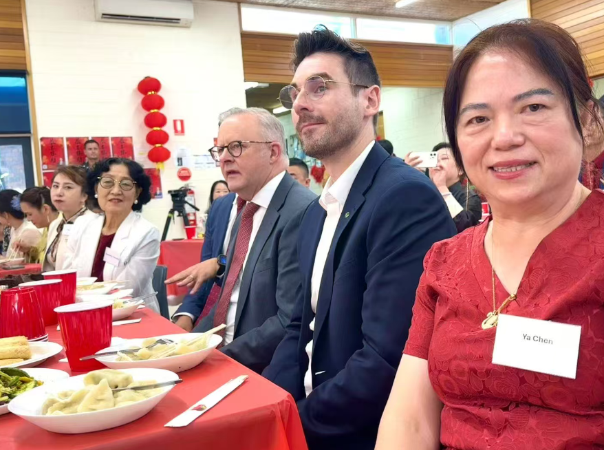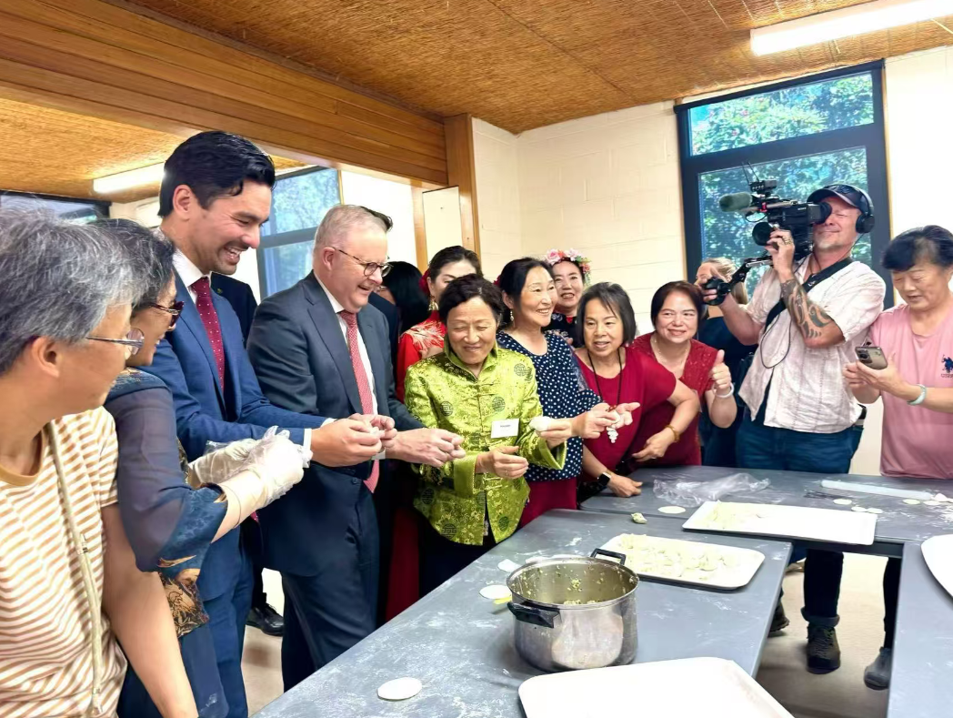 总理Anthony Albanese庆祝春节,直接与在华人社区参与聚餐,餐桌上摆的饺子和各种菜肴,周边挂着灯笼,年味满满。
