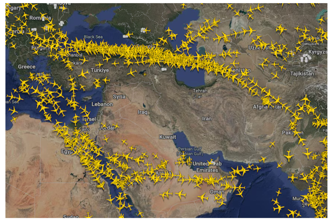 卡塔尔、叙利亚、伊朗、伊拉克、科威特和巴林已宣布关闭领空。民航航班开始迅速撤离这一区域,干扰规模之大,几十年来罕见。