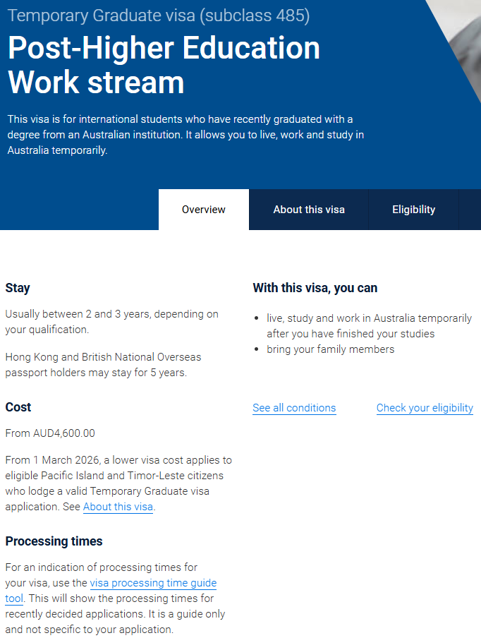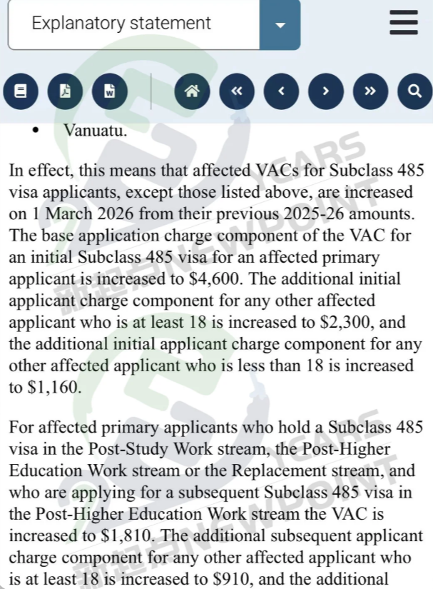 根据最新公布的调整内容,自2026年3月1日起,受影响的Subclass 485签证申请人,其签证申请费(VAC)将按照新的标准执行,取代此前2025-26财年的收费标准。