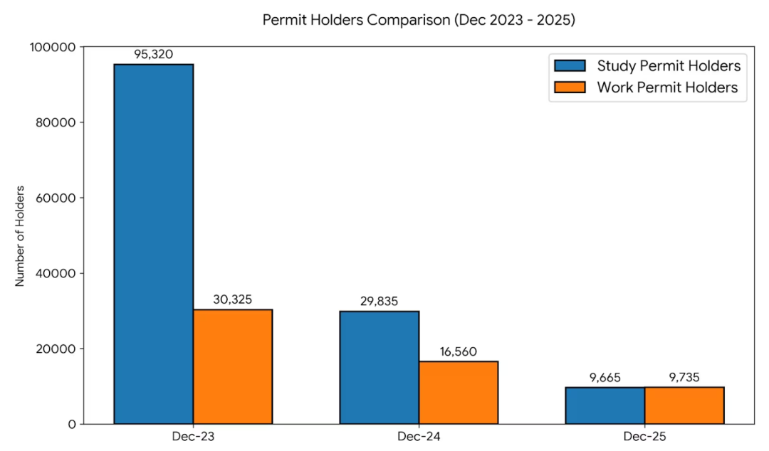 根据加拿大政府移民数据,2025年12月,加拿大新入境的学习许可持有人仅为9,665人,相比2023年12月的95,320人,下降约89.9%。同样,新入境的工作许可持有人为9,735人,相比2023年12月的30,325人,下降约67.9%。这一变化标志着近年来加拿大临时居民入境数量出现了最剧烈的下降之一。