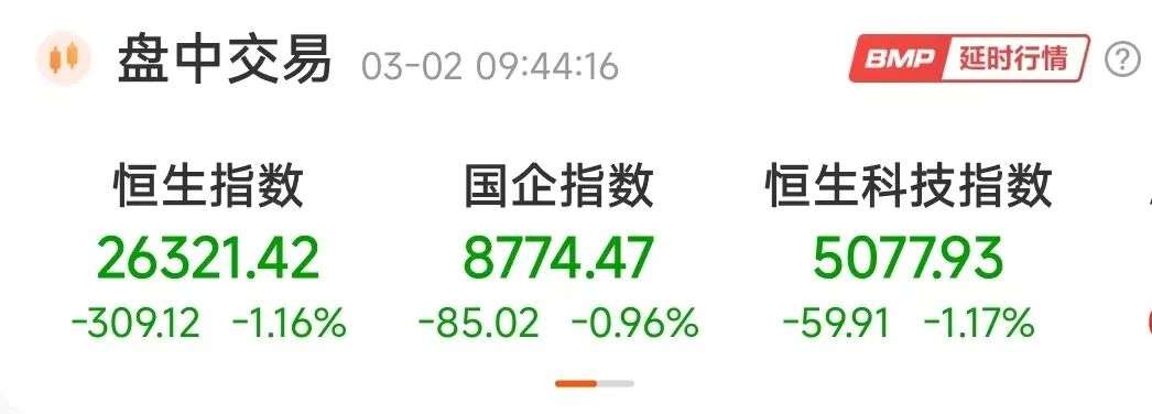 3月2日,香港恒生指数开盘跌1.16%,恒生科技指数跌1.17%。