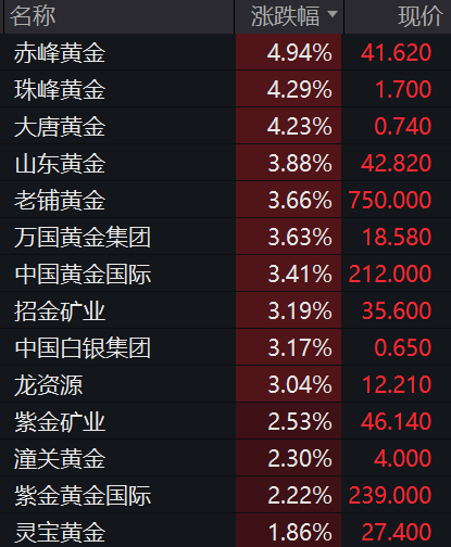 贵金属板块走强,赤峰黄金、珠峰黄金、大唐黄金涨超4%。