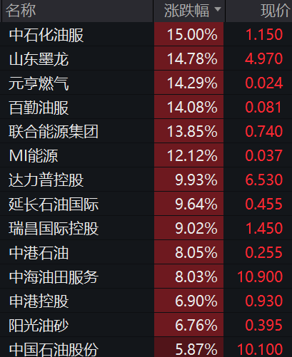石油石化板块大涨,中石化油服涨15%,山东墨龙、元亨燃气涨逾14%,中国石油股份、中国海洋石油涨逾5%。
