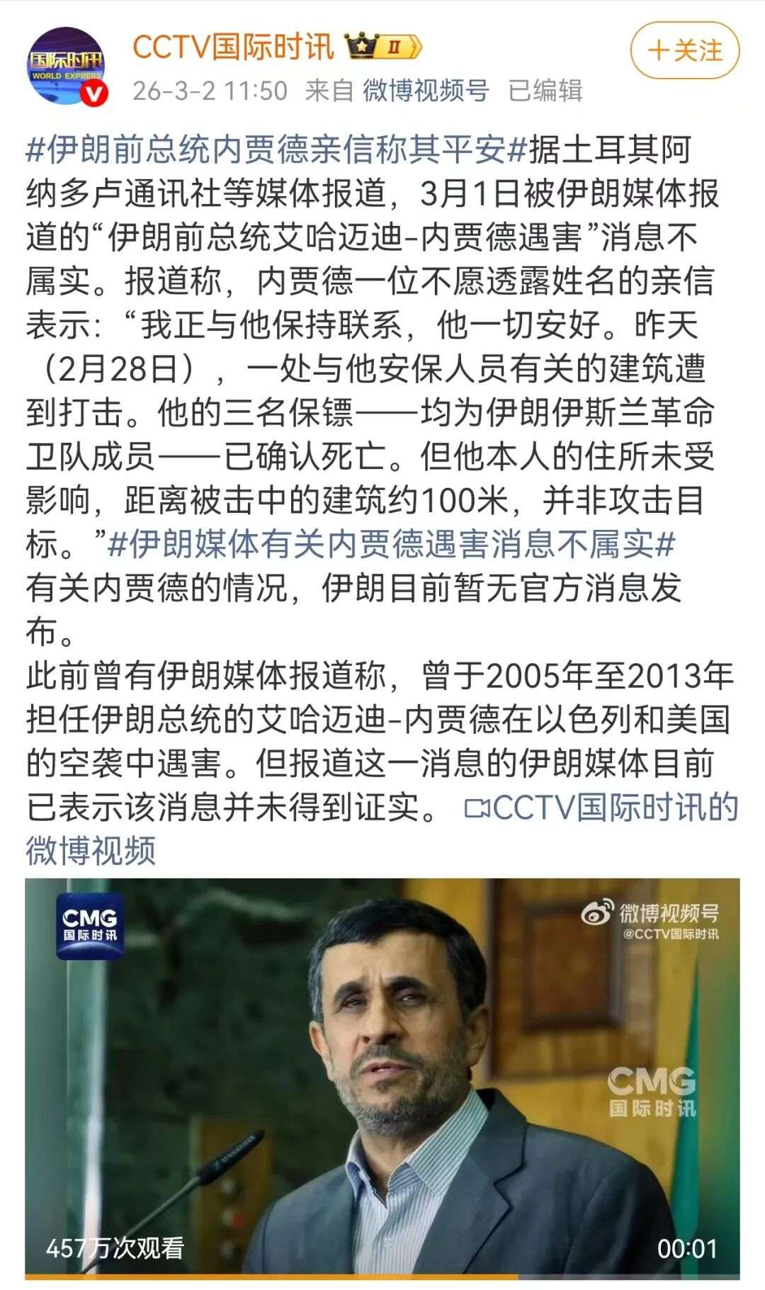 据@CCTV国际时讯援引土耳其阿纳多卢通讯社等媒体报道,3月1日被伊朗媒体报道的“伊朗前总统艾哈迈迪·内贾德遇害”消息不属实。