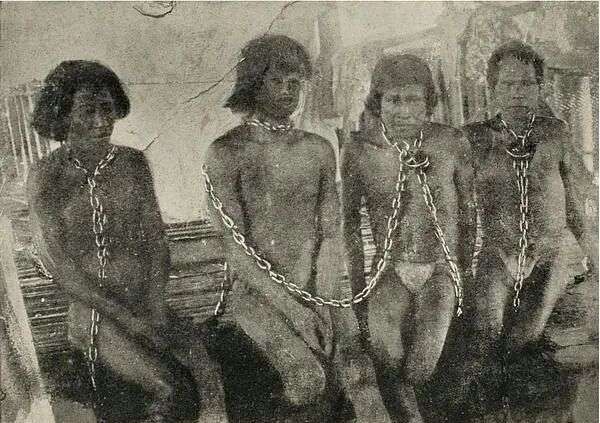 成千上万的原住民被抓走成为奴隶,被迫在自己的土地上为侵略者采割橡胶。不服从的人被鞭打、被锁链拴住、被猎犬追捕。妇女被强暴。部落被系统性地屠杀。