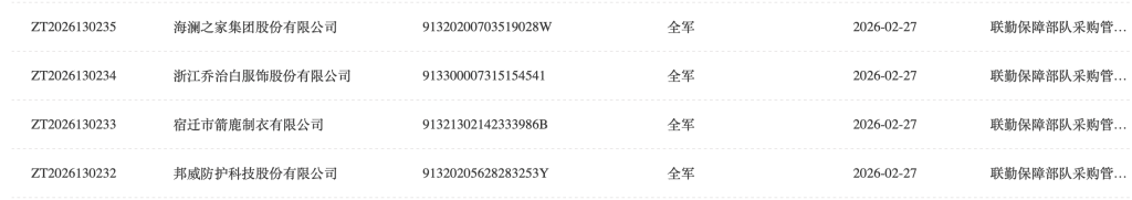 当日,军队采购网还发布了关于对浙江乔治白服饰股份有限公司、宿迁市箭鹿制衣有限公司、邦威防护科技股份有限公司暂停处理公告概要,这三家公司也均因中标后无正当理由拒不签订合同,根据军队供应商管理相关规定,自2026年2月27日起暂停其参加全军物资工程服务采购活动资格。