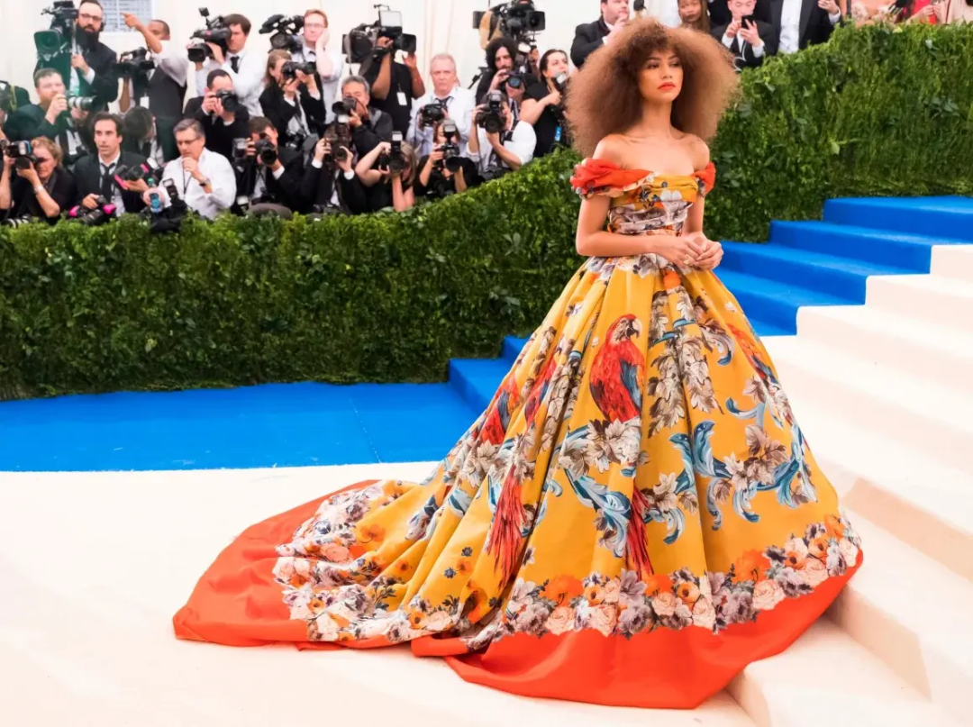 2017年的Metgala,赞达亚身穿一件印有鹦鹉图案的Dolce & Gabbana蓬蓬裙亮相。
