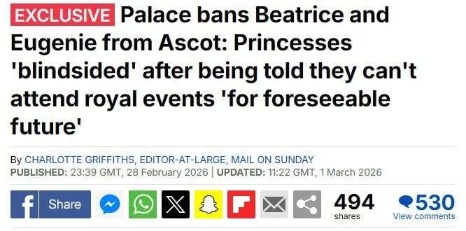 据最新报道,王室赛马会(Royal Ascot)已经拉黑了碧翠丝和尤金妮公主,并且在“可见的未来”中,她俩都不能再参加任何王室活动了。