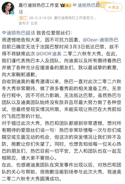 3月3日下午,原计划前往法国参加活动的中国知名女星迪丽热巴工作室确认,受不可抗力影响,迪丽热巴将无法按原计划抵达巴黎。