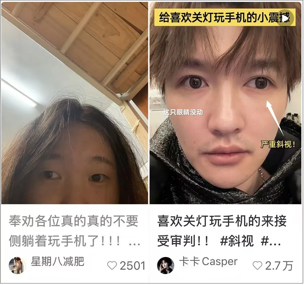 更有网友现身说法,由于经常侧躺看手机,眼睛疑似已经出现斜视。