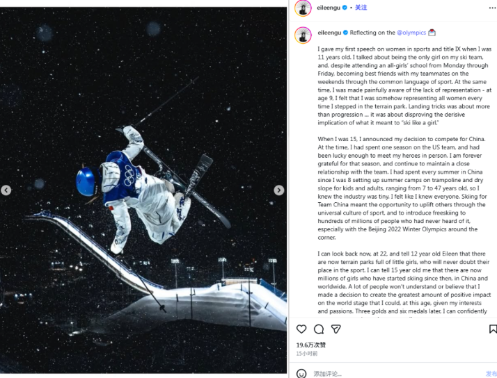 “现在,我还可以告诉15岁的自己:从那时起,中国乃至全世界都拥有了数百万开始接触滑雪这项运动的女孩。”