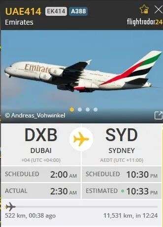 这趟由阿联酋执飞的航班预计将于今晚稍晚些时候抵达悉尼。