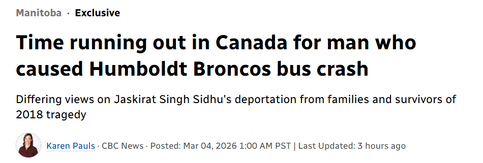 2018年造成16人死亡的洪堡野马队(Humboldt Broncos)巴士惨案责任人 Jaskirat Singh Sidhu,可能在数周内被遣返回印度。这一决定意味着他将与身为加拿大公民的妻子及两个年幼子女分离。与此同时,部分遇难者家属则认为,他本应在多年前就被驱逐出境。