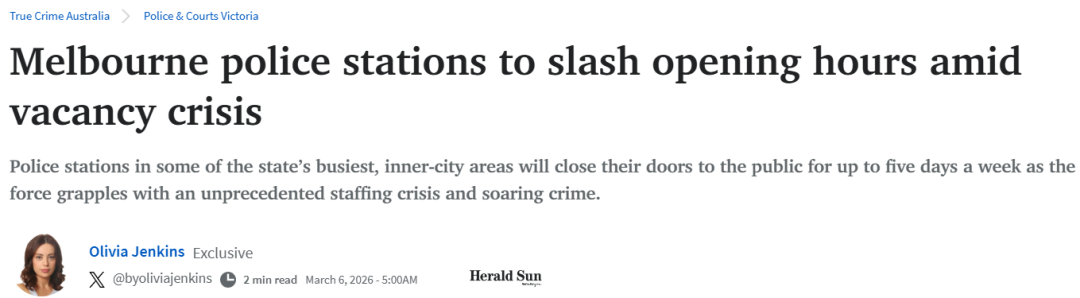 在维州犯罪率飙升的大环境之下,维州警察系统却迎来了史诗级别的难题——因为职位严重空缺,墨尔本很多繁忙地区的警察局根本无法保证正常运营,部分警局一周只开放两天!