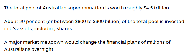 澳洲养老金体系规模约 4.5万亿澳元,其中约20%投资在美国资产。如果全球股市因为战争和能源危机出现大幅下跌,许多澳洲人的退休储蓄也可能受到冲击。