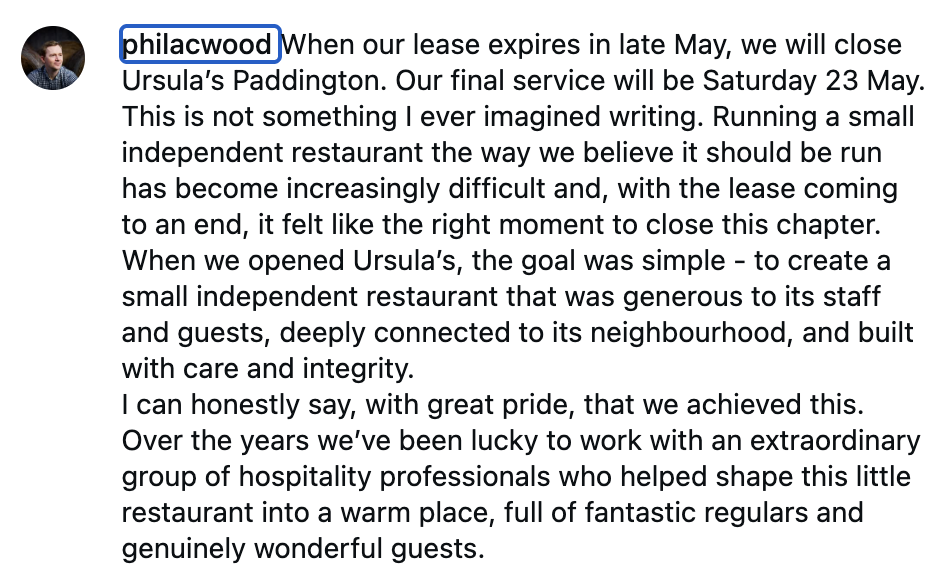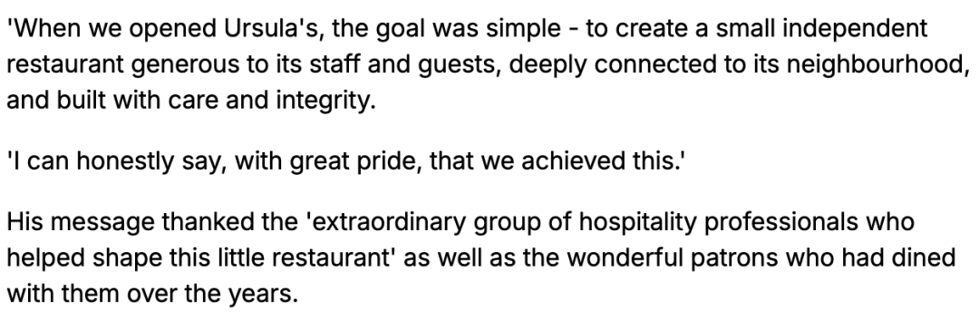 他在信中感谢了“一群卓越的餐饮专业人士,是他们共同塑造了这家小餐厅”,也感谢每一位光临餐厅的食客:“我们热爱与悉尼人以及来自世界各地的朋友分享这一切。”