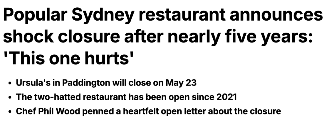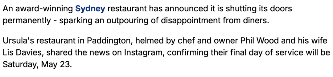 Ursula's的落幕,是悉尼餐饮界的一个优雅篇章。”