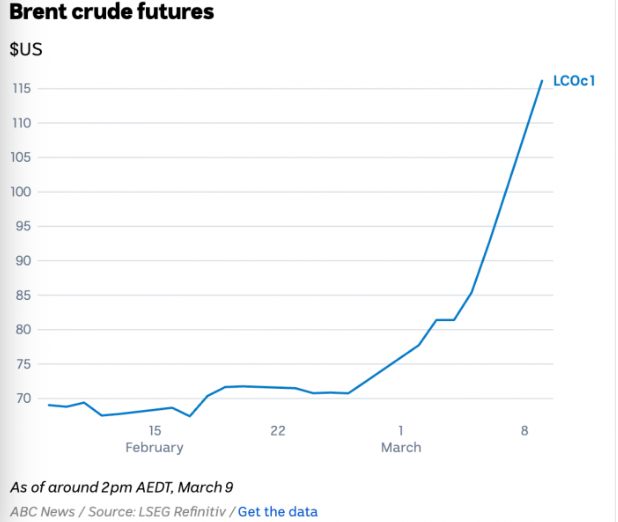 分析师称,随着中东战争持续,油价今日大幅攀升,布伦特原油价格突破每桶115美元,当日涨幅超过25%。