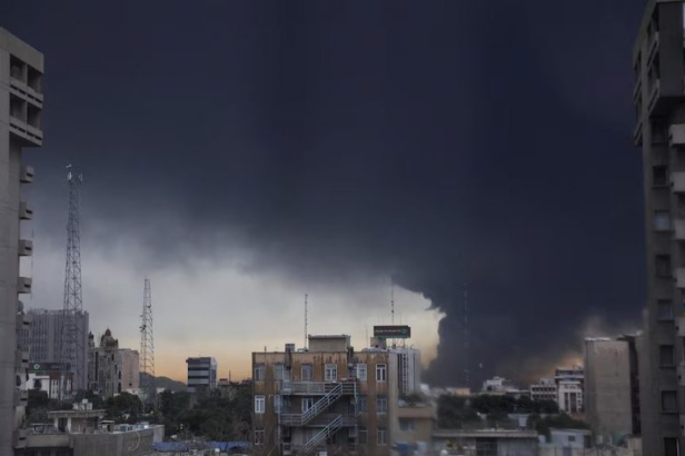 在伊朗首都德黑兰(Tehran)的一座炼油厂,据报道燃料储罐遭到袭击后,黑烟升腾入空。