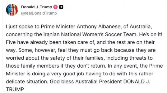 在此之前,特朗普在社媒发声,称如果澳大利亚不给伊朗女足援助,美国也会给:“如果允许伊朗女足被强制带回国,那么澳大利亚就犯了一个糟糕的人道主义错误,回国后她们很可能会被处死。别那样干,首相先生,给她们庇护。如果你不做,美国也会收留她们。”