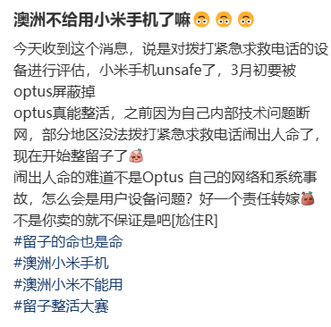 为什么只针对小米手机?Optus给出的说法是,使用小米手机在部分地区无法拨打紧急求救电话。明明是Optus自身网络的问题,但是现在要让部分手机型号来背锅...