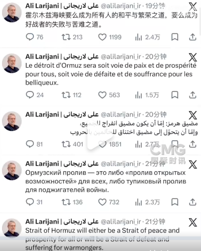 拉里贾尼还在其社交账号分别以波斯语、英语、俄语、阿拉伯语、法语和中文共6种语言发文写道:“霍尔木兹海峡要么成为所有人的和平与繁荣之道,要么成为好战者的失败与苦难之道。”